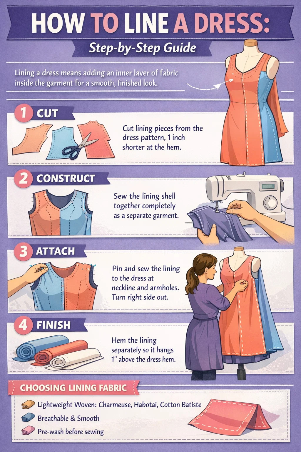 Podszewka sukienki oznacza dołączenie wewnętrznej warstwy materiału – zwykle lekkiego tkana tkanina jak poliestrowy Charmeuse, jedwabny habotai lub bawełniany batyst — do wewnętrznej strony zewnętrznej powłoki, aby sukienka zachowała swój kształt, była wygodna dla skóry i ukrywała braki szwów wewnętrznych. Proces polega na wycięciu fragmentów podszewki z tego samego wzoru co sukienka (z niewielkimi korektami), wszyciu podszewki osobno, a następnie połączeniu jej z sukienką przy dekolcie, podkrojach pach lub zamku przed wywróceniem całości na prawą stronę.