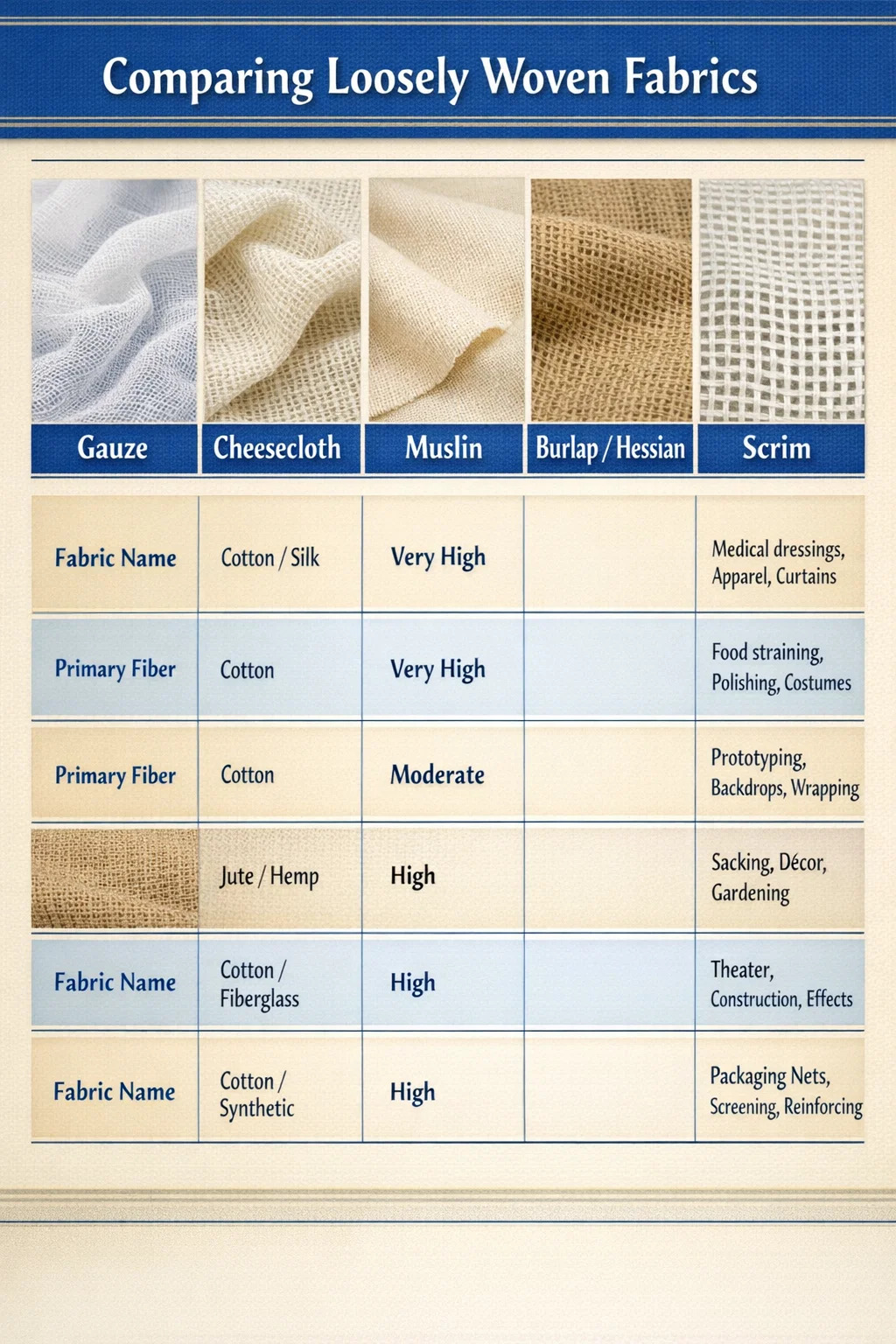 - Czy potrzebna jest miękkość czy szorstkość? Gaza bawełniana i muślin są miękkie w dotyku. Juta i juta są szorstkie i szorstkie — doskonale nadają się do dekoracji w stylu rustykalnym, ale nie nadają się do bezpośredniego kontaktu ze skórą bez obróbki.